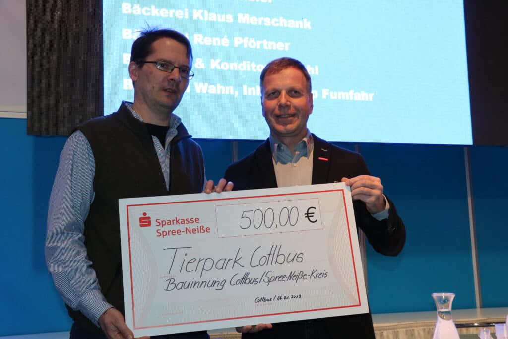 Einen Scheck in Höhe von 500 Euro übergab Innungsobermeister Ingo Krüger an den Tierparkdirektor Dr. Jens Kämmerling. Die Bauinnung Cottbus/Spree-Neiße spendete den Erlös aus der Zollstocktauschbörse der vergangenen Handwerkermessen dem Tierpark. Dafür soll eine Eckbank im Cottbuser Tierpark angeschafft werden. Die Bauinnung stockte den Erlös auf 500 Euro auf.